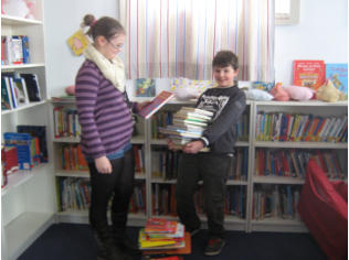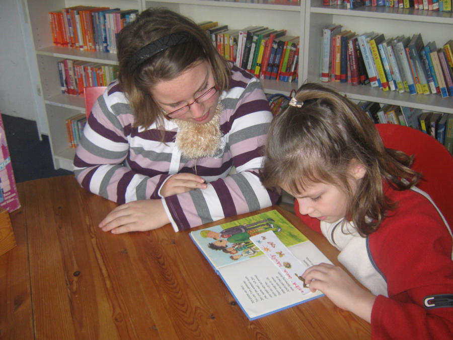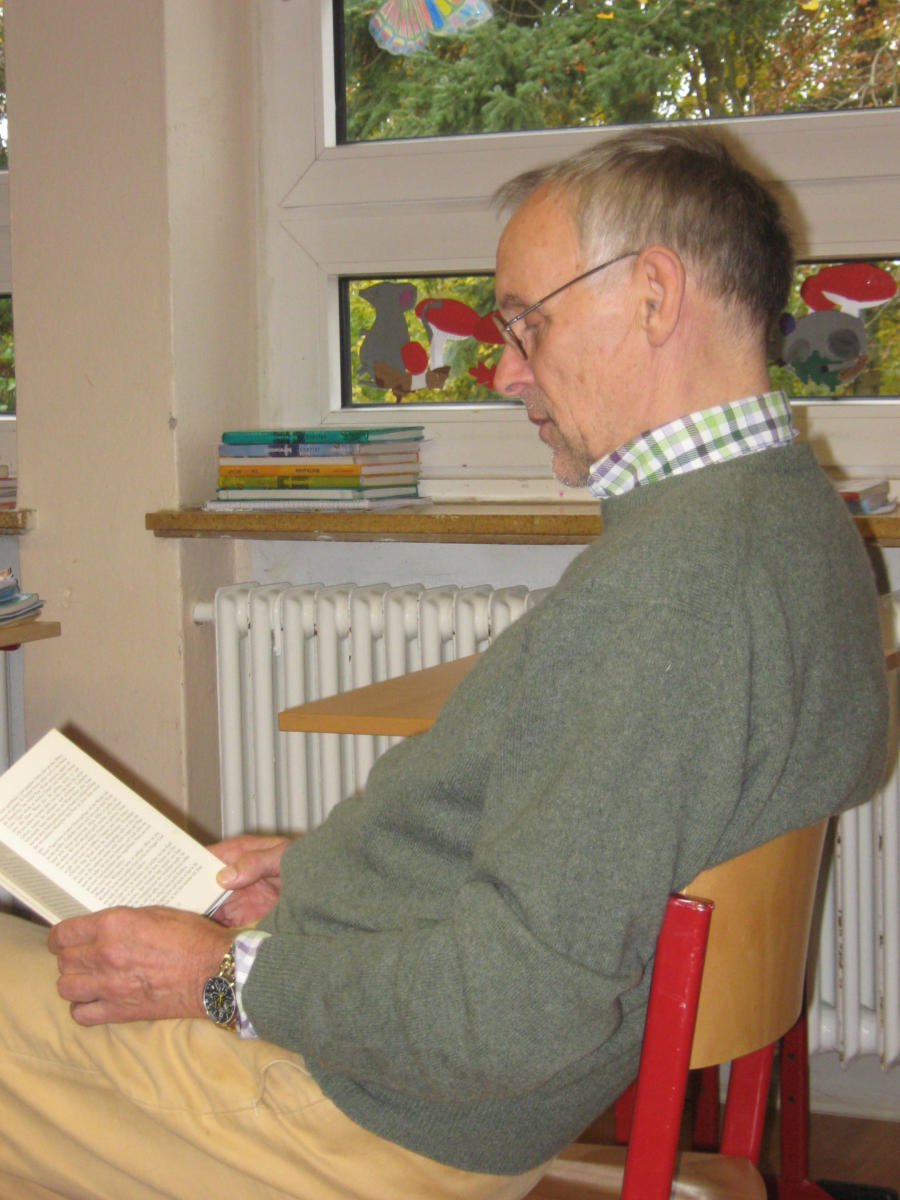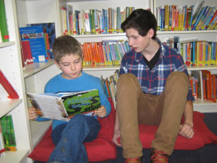 Zur SchulbüchereiLesen als GenussUnsere Schulbücherei ist in jeder ersten großen Pause geöffnet. Dann kann man in allen möglichen Büchern schmökern, am PC recherchieren oder ein Bücherquiz erledigen,aber auch mit Freunden gemütlich klönen oder ein sich bei einem Spiel vergnügen.Selbstverständlich wird auch für Essen und Getränke gesorgt.Immer donnerstags gibt es eine Vorlesepause, große Schüler/innen lesen dann für kleine.Manchmal veranstalten die Großen auch ein Bilderbuchkino für die Kleinen.Alle 1. bis 5. Klassen haben einen erwachsenen Lesepaten,der nicht aus der Schule selbst kommt und alle 4 bis 6 Wochen in „seiner“ Klasse vorliest. Immer montags in der 5. Stunde lesen unsere Achtklässler mit ihren kleinen Partnern aus den dritten Klassen.