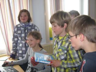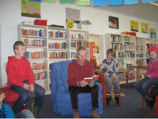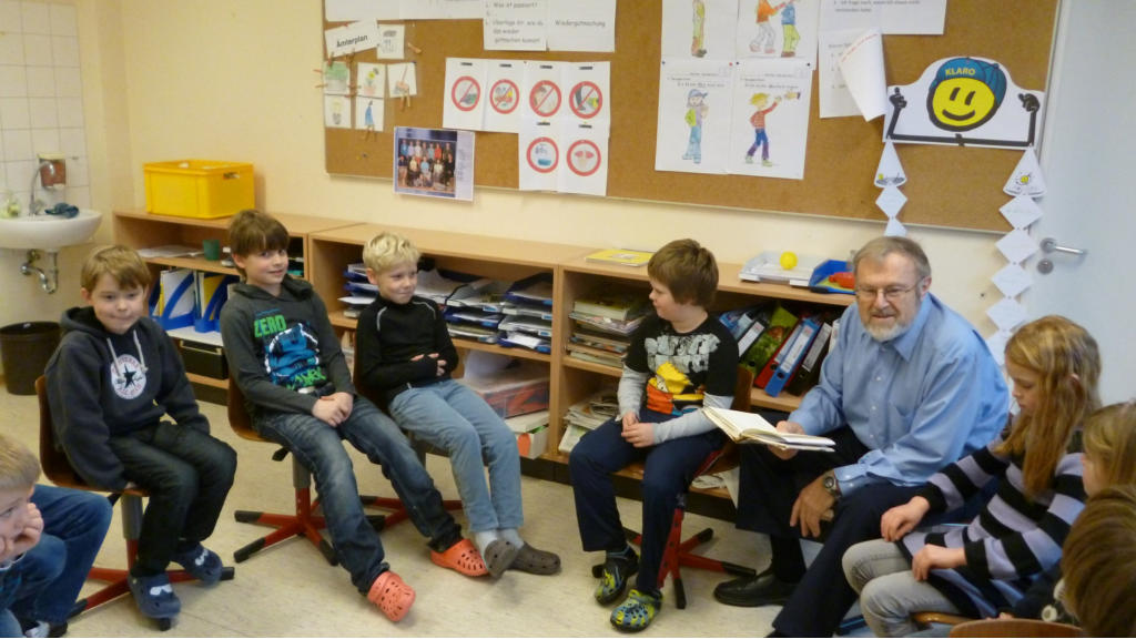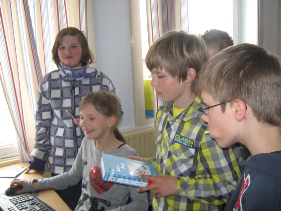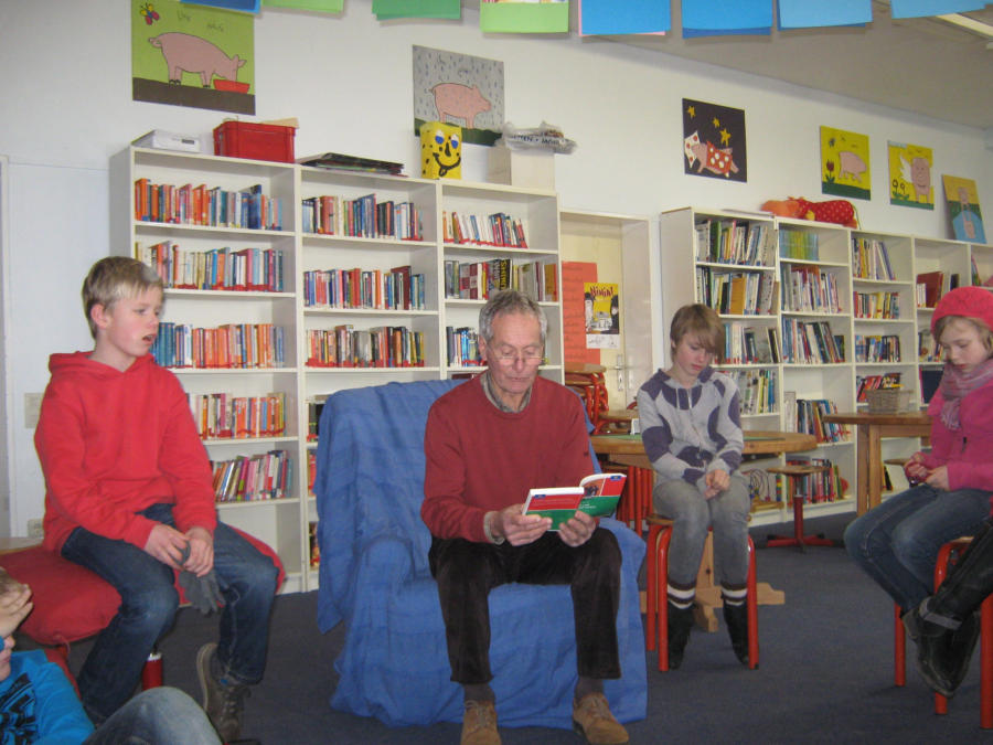 Zur SchulbüchereiLesen als GenussUnsere Schulbücherei ist in jeder ersten großen Pause geöffnet. Dann kann man in allen möglichen Büchern schmökern, am PC recherchieren oder ein Bücherquiz erledigen,aber auch mit Freunden gemütlich klönen oder ein sich bei einem Spiel vergnügen.Selbstverständlich wird auch für Essen und Getränke gesorgt.Immer donnerstags gibt es eine Vorlesepause, große Schüler/innen lesen dann für kleine.Manchmal veranstalten die Großen auch ein Bilderbuchkino für die Kleinen.Alle 1. bis 5. Klassen haben einen erwachsenen Lesepaten,der nicht aus der Schule selbst kommt und alle 4 bis 6 Wochen in „seiner“ Klasse vorliest. Immer montags in der 5. Stunde lesen unsere Achtklässler mit ihren kleinen Partnern aus den dritten Klassen.
